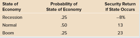 State of Probablity of State of Economy Security Return If State Occurs Economy Recession .25 -8% Normal .50 13 Вoom .25 23