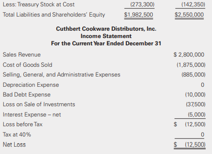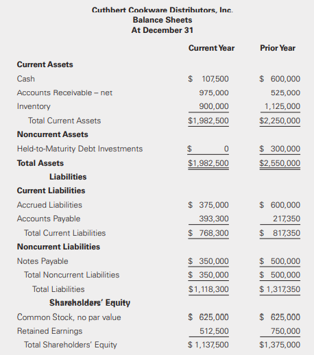 > Cuthbert Cookware Distributors, Inc. is a wholesale distributor of brand-name cookware products. The company’s current-year comparative balance sheets and income statement follow. Additional information: • All dividen