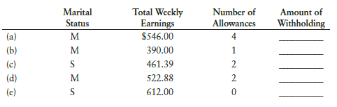determine the amount of federal income tax an employer should withhold weekly for employees with the following marital status, earnings, and withholding allowances: