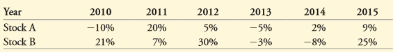 Year 2010 2011 2012 2013 2014 2015 Stock A -10% 20% 5% -5% 2% 9% Stock B 21% 7% 30% -3% -8% 25%
