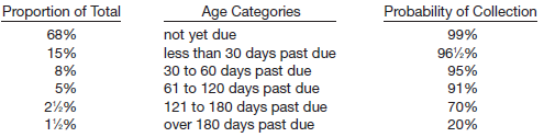 Proportion of Total Age Categories Probability of Collection 68% not yet due less than 30 days past due 30 to 60 days past due 61 to 120 days past due 121 to 180 days past due over 180 days past due 99% 15% 96%% 8% 95% 5% 91% 2%% 70% 1%% 20%
