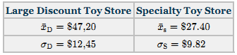 Various types of retail outlets sell toys during the holiday season. Among them are specialty toy stores, large discount toy stores, and other retailers that carry toys as only one part of their stock of goods. Is there any difference in the dollar amount of a customer purchase between a large discount toy store and a specialty toy store if they carry relatively comparable types of toys? Suppose in December a random sample of 60 sales slips is selected from a large discount toy outlet and a random sample of 40 sales slips is selected from a specialty toy store. The data gathered from these samples follow.