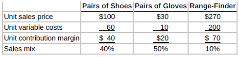 Pairs of Shoes Pairs of Gloves Range-Finder Unit sales price $100 $30 $270 Unit variable costs 60 10 200 Unit contribution margin $ 40 $20 $ 70 Sales mix 40% 50% 10%