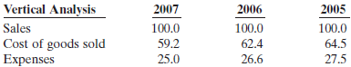 Vertical Analysis 2007 2006 2005 Sales Cost of goods sold Expenses 100.0 100.0 100.0 59.2 62.4 64.5 25.0 26.6 27.5