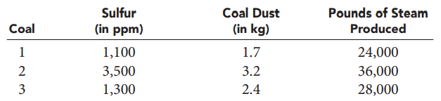 Virginia Tech operates its own power generating plant. The electricity generated by this plant supplies power to the university and to local businesses and residences in the Blacksburg area. The plant burns three types of coal, which produce steam that drives the turbines that generate the electricity. The Environmental Protection Agency (EPA) requires that for each ton of coal burned, the emissions from the coal furnace smoke stacks contain no more than 2,500 parts per million (ppm) of sulfur and no more than 2.8 kilograms (kg) of coal dust. However, the managers of the plant are concerned about the environment and want to keep these emissions to a minimum. The following table summarizes the amounts of sulfur, coal dust, and steam that result from burning a ton of each type of coal.