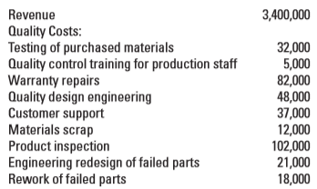Revenue 3,400,000 Quality Costs: Testing of purchased materials Quality control training for production staff Warranty repairs Quality design engineering Customer support Materials scrap Product inspection Engineering redesign of failed parts Rework of failed parts 32,000 5,000 82,000 48,000 37,000 12,000 102,000 21,000 18,000