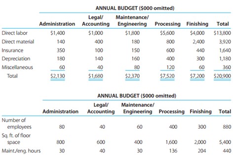 Wakowski Companyâs annual budget for its three support departments (administration, legal/accounting, and maintenance/engineering) and its two production departments (processing and finishing) is as follows: