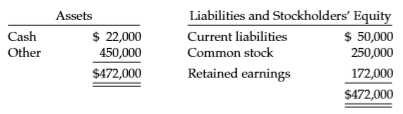 Liabilities and Stockholders' Equity $ 50,000 250,000 Assets Cash Other $ 22,000 450,000 Current liabilities Common stock $472,000 Retained earnings 172,000 $472,000