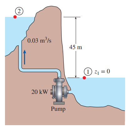 Water is pumped from a lower reservoir to a higher reservoir by a pump that provides 20 kW of shaft power. The free surface of the upper reservoir is 45 m higher than that of the lower reservoir. If the flow rate of water is measured to be 0.03 m3/s, determine mechanical power that is converted to thermal energy during this process due to frictional effects.