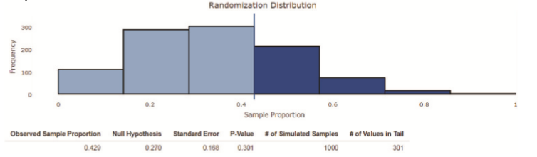 Randomization Distribution 300 200 100 0.4 0.6 0.0 Sample Proportion Observed Sample Proportion Nul Hypothesis Standard Error P-Value of Simulated Samples #of Values in Tail 0.429 0 270 1000 301 0.168 0.301 Frequency