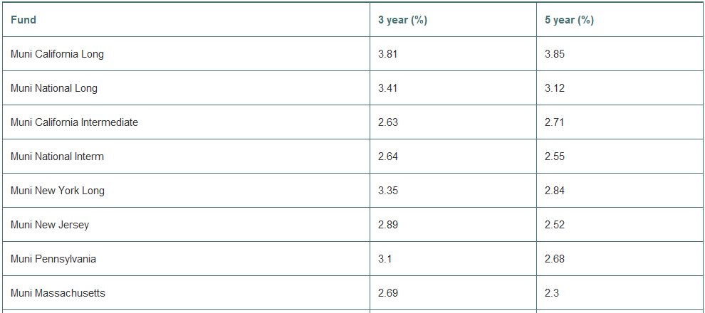 We have a sample of municipal mutual funds that report their return (%) in the previous 3years and the previous 5 years.