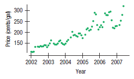 > Here are data on the monthly price of Delicious apples and gas, which are both components of the Consumer Price Index. The timeplot shows the years 2006–2009 for apples; the data table shows just 2006, for both. For the Gas prices: (D