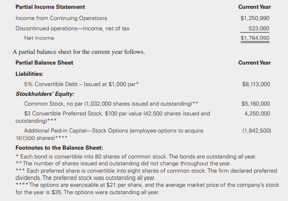 > Use the same information in E20-4 except assume that the company issued $10,000,000, 2.5% convertible bonds on June 30 (i.e., $250,000 coupon interest annually), which are convertible into 325,000 shares of common stock. Based on this information, comput