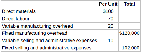 Per Unit Total Direct materials $100 Direct labour 70 Variable manufacturing overhead 20 $120,000 Fixed manufacturing overhead Variable selling and administrative expenses 10 Fixed selling and administrative expenses 102,000