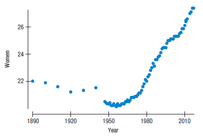 Weddings are one of the fastest growing businesses; about $40 billion is spent on weddings in the United States each year. But demographics may be changing, and this could affect wedding retailersâ marketing plans. Is there evidence that the age at which women get married has changed over the past 100 years? The scatterplot shows the trend in age at first marriage for American women. (U.S. Census Bureau; www.census.gov)
