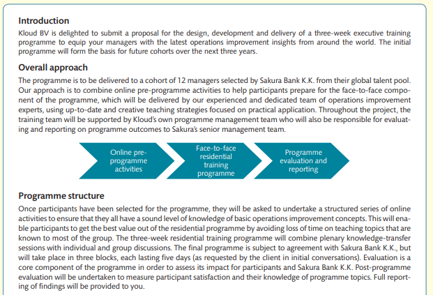 Well thatâs the bad news!â, said Tao, the Managing Director of Kloud BV, a consulting and executive development firm headquartered in Amsterdam, specializing in operations and supply chain improvement. âThe good news is that Chao should be out of hospital in a couple of weeks. It may take a few months before heâs fully fit, but it all looks very promising.â Maria was pleased to hear that things were looking more positive for Chao after his accident. She had only been at the company for six weeks, having taken up a role as a junior project manager, but had already grown to respect and like Chao. âButâ, continued Tao, âthat does leave us in a tricky situation. As you know, Chao was in charge of the big project with Sakura Bank in Tokyo, which Iâm going to look after until heâs back at work. He was also just setting up a smaller project for them, training senior managers, which will run out of their facilities in Osaka. I appreciate youâre pretty new here, but Iâd like you to take on the project management for this one. Chao recommended you, so it seems youâve made a very good impression!â Maria was pleased to hear that Chao, her immediate boss, had a good impression of her. âWell, Iâm very happy to take this on Taoâ, she said as she quickly looked through the draft proposal for the project that Chao had been developing for Sakura Bank just before his accident (see Figure 15.18).As Maria read through the proposal, she got a clearer idea of what was needed, but she still had a number of questions. âThereâs plenty of information for me here Tao. Still, what constraints do I need to be aware of?â Tao picked up a notebook from the corner of his desk. âGood question! I was chatting to Chao earlier today and he mentioned a few things. The client kick-off meeting takes place online next Monday â so thatâs week 1 on this project. Sakura have already said that, ideally, theyâd like the residential programmed to start in week 6. Do you think thatâs a realistictime frame? Theyâre also pretty keen that pre-programmed activities and the residential programmed elements start on Mondays, and that Saturdays and Sundays are non-working days.â Maria and Taoâs discussion then moved to how best to resource the project. Within about ten minutes, they had identified most of the key players who would be involved: