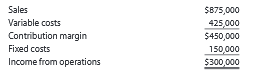 Sales $875,000 Variable costs Contribution margin 425,000 $450,000 Fixed costs 150,000 $300,000 Income from operations