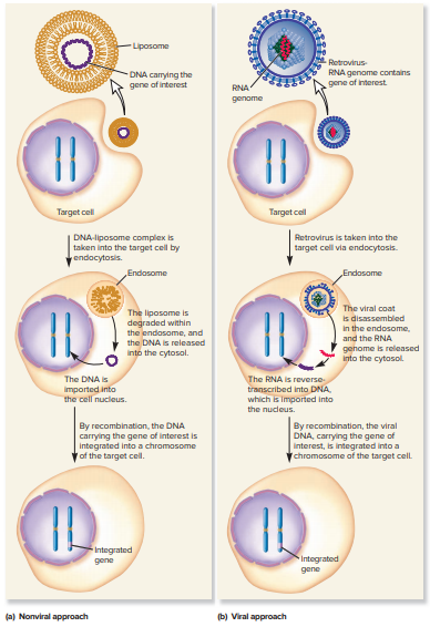 Liposome -DNA canying the gene of interest Retrovirus- RNA genome contains gene of interest RNA genome Target cell Target cell DNA-liposome complex is taken into the target cell by endocytosis. Retrovirus is taken into the target cell via endocytosis. Endosome Endosome The viral coat The liposome is degraded within the endosome, and the DNA is released Into the cytosol. is disassembled in the endosome, and the RNA gehome is released into the cytosol. The RNA is reverse transcribed into DNA. which is Imported into The DNA is Imported into the cell nucleus. the nucdeus. By recombination, the DNA carrying the gene of interest is integrated into a chromosome of the target cell. By recombination, the viral DNA, carrying the gene of interest, is integrated into a 'chromosome of the target cell Integrated gene Integrated gene (a) Nonviral approach (b) Viral approach