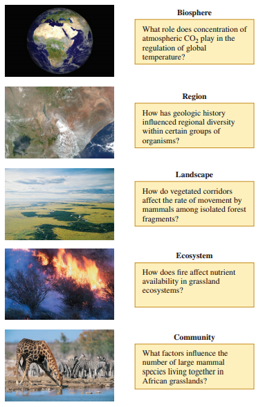 Biosphere What role does concentration of atmospheric CO, play in the regulation of global temperature? Region How has geologic history influenced regional diversity within certain groups of organisms? Landscape How do vegetated corridors affect the rate of movement by mammals among isolated forest fragments? Ecosystem How does fire affect nutrient availability in grassland ecosystems? Community What factors influence the number of large mammal species living together in African grasslands? Community What factors influence the number of large mammal species living together in African grasslands? Interactions Do predators influence where zebras feed in the landscape? Population What factors control zebra populations? Individuals How do zebras regulate their internal water balance? Figure 1.1 Levels of ecological organization and examples of the kinds of questions asked by ecologists working at each level. These ecological levels correspond broadly to the sections of this book.