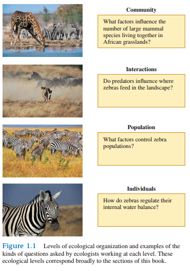 > While an ecologist may focus on a particular level of ecological organization shown in figure 1.1, might other levels of organization be relevant, for example, does an ecologist studying factors limiting numbers in a population of zebras need to consider