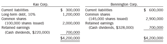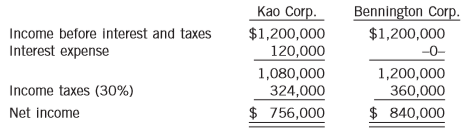 Као Corp. Bennington Corp. $ 300,000 Current liabilities 1,200,000 Common shares $ 600,000 Current liabilities Long-term debt, 10% Common shares (145,000 shares issued) 2,900,000 (100,000 shares issued) Retained earnings (Cash dividends, $220,000) 2,000,000 Retained earnings (Cash dividends, $328,000) 700,000 700,000 $4,200,000 $4,200,000 Као Сoгр. Bennington Corp. $1,200,000 120,000 Income before interest and taxes $1,200,000 Interest expense -0- 1,080,000 324,000 $ 756,000 1,200,000 360,000 $ 840,000 Income taxes (30%) Net income