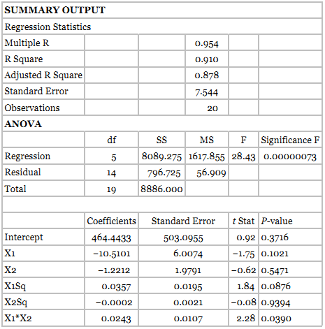 What follows is Excel output from a regression model to predict y using x1, x2, x21, x22, and the interaction term, x1x2. Comment on the overall strength of the model and the significance of each predictor. The data follow the Excel output. Develop a regression model with the same independent variables as the first model but without the interaction variable. Compare this model to the model with interaction.