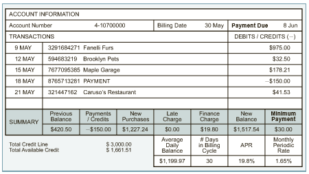 ACCOUNT INFORMATION Account Number 4-10700000 Billing Date 30 May Payment Due 8 Jun TRANSACTIONSS DEBITS / CREDITS (-) 9 MAY 3291684271 Fanelli Furs $975.00 12 MAY 594683219 Brooklyn Pets $32.50 15 MAY 7677095385 Maple Garage $178.21 18 MAY 8765713281 PAYMENT -$150.00 21 MAY 321447162 Caruso's Restaurant $41.53 Previous Payments I Credits New Purchases Late Finance New Balance Minimum Payment SUMMARY Balance Charge Charge $420.50 -$150.00 $1,227.24 $0.00 $19.80 $1,517.54 $30.00 # Days in Billing Cycle Average Monthly Credit Line Tatal Available Credit $3,000.00 $ 1,661.51 Daily Balance Periodic Rate APR $1, 199.97 30 19.8% 1.65%