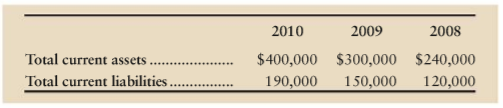 2010 2009 2008 Total current assets $400,000 $300,000 $240,000 Total current liabilities. 190,000 150,000 120,000