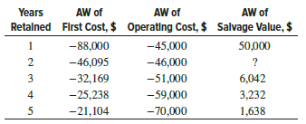 > An injection molding system has a first cost of $180,000, and an annual operating cost of $84,000 in years 1 and 2, increasing by $5000 per year thereafter. The salvage value of the system is 25% of the first cost regardless of when the system is retired
