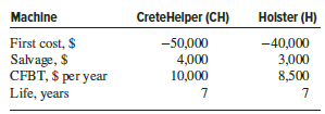 When JJ and Sons was awarded a contract to pour a skyscraperâs foundation, the father had to choose between two pieces of equipment needed to supplement pumping of concrete into foundation settings. Estimates are below. Both machines have an estimated 7-year useful life; however, MACRS depreciation is over a 5-year recovery period. The effective tax rate is 40%, and the after-tax MARR is 8% per year. Your father asked you, one of the sons, to recommend one machine.