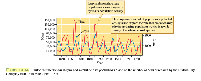> Why is it not surprising that snowshoe hare populations are controlled by a combination of factors, food and predators (see fig. 14.15), and not by a single environmental factor? Figure 14.15: