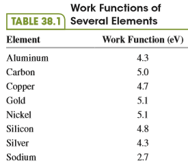 Work Functions of TABLE 38.1 Several Elements Element Work Function (eV) Aluminum 4.3 Carbon 5.0 Сорper 4.7 Gold 5.1 Nickel 5.1 Silicon 4.8 Silver 4.3 Sodium 2.7