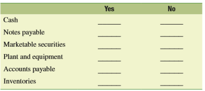 Yes No Cash Notes payable Marketable securities Plant and equipment Accounts payable Inventories || | | | |||