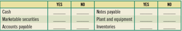YES NO YES NO Notes payable Plant and equipment Cash Marketable securities | Accounts payable Inventories ||