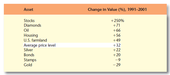 Asset Change In Value (%), 1991–2001 Stocks +250% +71 Diamonds Oil +66 Housing U.S. farmland Average price level Silver +56 +49 +32 +22 Bonds +20 Stamps Gold -9 - 29