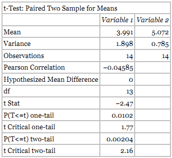 Why do employees âblow the whistleâ on other employees for unethical or illegal behavior? One study conducted by the AICPA reported the likelihood that employees would blow the whistle on another employee for such things as unsafe working conditions, unsafe products, and poorly managed operations. On a scale from 1 to 7, with 1 denoting highly improbable and 7 denoting highly probable, unnecessary purchases received a 5.72 in the study. Suppose this study was administered at a company and then all employees were subjected to a one-month series of seminars on reasons to blow the whistle on fellow employees. One month later the study was administered again to the same employees at the company in an effort to determine whether the treatment had any effect. The following Excel output shows the results of the study. What were the sample sizes? What might the hypotheses have been? If α = .05, what conclusions could be made? Which of the statistical tests presented in this chapter is likely to have been used? Assume that differences in scores are normally distributed.