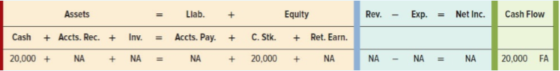 Assets Llab. Equity Rev. Exp. = Net Inc. Cash Flow Cash + Accts. Rec. + Inv. Accts. Pay. C. Stk. + Ret. Earn. 20,000 + NA NA NA 20,000 NA NA NA NA 20,000 FA