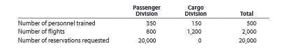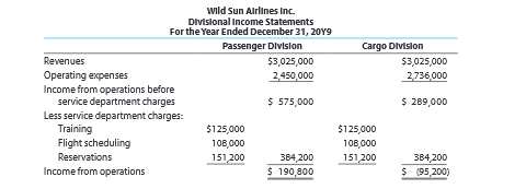 wild Sun Alrlines Inc. Divisional Income Statements For the Year Ended December 31, 20Y9 Passenger Divislon $3,025,000 Cargo Division Revenues $3,025,000 Operating expenses Income from operations before service department charges Less service department charges: Training Flight scheduling 2,450,000 2,736,000 $ 575,000 $ 289,000 $125,000 $125,000 108,000 108,000 Reservations 151,200 384,200 151,200 384,200 Income from operations $ 190,800 $ (95,200) Passenger Divislon Cargo Dlvision Total Number of personnel trained Number of flights Number of reservations requested 350 150 500 B00 1,200 2,000 20,000 20,000