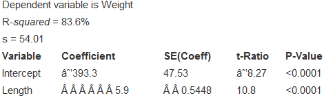 Wildlife researchers monitor many wildlife populations by taking aerial photographs. Can they estimate the weights of alligators accurately from the air? Here is a regression analysis of the Weight of alligators (in pounds) and their Length (in inches) based on data collected about captured alligators.