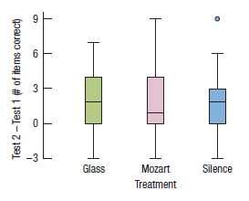 c) The boxplots show the differences in score before and after treatment for the three groups. Did the Mozart group show improvement?
