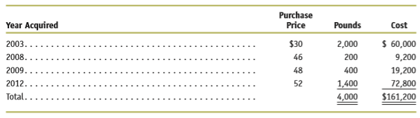 Purchase Price Year Acquired Pounds Cost 2003.. $30 2,000 $ 60,000 2008. 46 200 9,200 2009. 48 400 19,200 2012. 52 1,400 4,000 72,800 Total. $161,200
