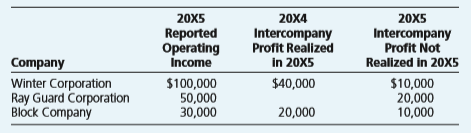 20X5 20X4 20X5 Reported Operating Intercompany Profit Realized in 20X5 Intercompany Profit Not Realized in 20X5 Company Income Winter Corporation Ray Guard Corporation Block Company $100,000 50,000 30,000 $40,000 $10,000 20,000 10,000 20,000