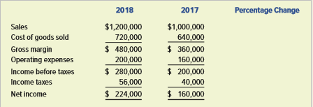 2018 2017 Percentage Change $1,200,000 $1,000,000 640,000 $ 360,000 Sales Cost of goods sold 720,000 $ 480,000 Gross margin Operating expenses 200,000 160,000 Income before taxes $ 280,000 $ 200,000 Income taxes 56,000 40,000 Net income $ 224,000 $ 160,000