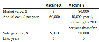 With the estimates shown below, Sarah needs to determine the trade-in (replacement) value of machine X that will render its AW equal to that of machine Y at an interest rate of 8% per year. Determine the RV