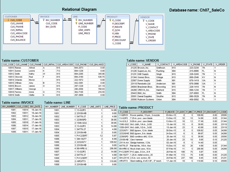 Relational Diagram Database name: Ch07_SaleCo CUSTOMER INVOICE LINE PRODUCT VENDOR 8 INV_NUMBER Y LINE_NUMBER 8 P_CODE P_DESCRIPT Y CUS CODE 00 V INV_NUMBER CUs CODE INV_DATE 8 V_CODE CUS_LNAME CUS FNAME V_NAME P_CODE P_INDATE v CONTACT CUS INITIAL LINE_UNITS P QOH V_AREACODE CUS AREACODE LINE_PRICE P_MIN V_PHONE V STATE CUS_PHONE P_PRICE P_DISCOUNT CUS_BALANCE V_ORDER V_CODE Table name: CUSTOMER Table name: VENDOR HIE CUS_CODE CUS LNAME CUS FNAME CUS_NITIAL CUS AREACODE CUS PHONE CUS_BALANCE V_CODE V_ NAME V_CONTACT V_AREACODE V_PHONE V_STATE V_ORDER 10010 Ramas Alfred A 615 844-2573 0.00 223-3234 21225 Bryson, Inc. 21226 SuperLoo, Inc. 21231 DSE Supply Smithson 615 TN Y 10011 Dunne Leona K 713 894-1238 0.00 215-8995 Flushing Singh 904 FL 10012 Smith Kathy 894-2285 345.86 536.75 615 615 228-3245 TN Y 10013 Olowski Paul F 615 894-2180 21344 Gomez Bros. Ortega 615 889-2546 KY 10014 Orlando Мугоn 615 222-1672 0.00 22567 Dome Supply Smith 901 678-1419 GA 10015 O'Brian Amy 713 442-3381 00 23119 Randsets Ltd. Anderson 901 678-3998 GA Y 10016 Brown James 615 297-1228 221.19 24004 Brackman Bros. Browning 615 228-1410 TN 10017 Wilians George 615 290-2556 768.93 24288 ORDVA, Inc. Hakford 615 898-1234 TN Y 10018 Farriss 382-7185 297-3809 Anne G 713 216.55 25443 BSK, Inc. 25501 Damal Supplies Smith 904 227-0093 FL 10019 Smith Olette K 615 0.00 Smythe 615 890-3529 TN 25595 Rubicon Systems Orton 904 456-0092 FL Y Table name: INVOICE Table name: LINE NV NUMBER CUs_CODE INV_DATE INV_NUMBER LINE_NUMBER P_CODE 1 13-02P2 LINE PRICE Table name: PRODUCT LINE_UNITS 1001 10014 16-Jan-16 1001 14.99 P_CODE 110ER/31 Power painter, 15 psi., 3-nozzle 13-02P2 7.25-in. pwr. saw blade 10011 P_DESCRIPT P_INDATE P_QOH P_MN P_PRICE P_DISCOUNT V_CODE 1002 16-Jan-16 1001 2 23109-HB 1 9.95 03-Nov-15 8 5 109.99 0.00 25595 1003 10012 16-Jan-16 1002 1 54778-2T 2 4.99 13-Dec-15 32 15 14.99 0.05 21344 1004 10011 17-Jan-16 1003 1 2238/OPD 38.95 14-Q1L3 9.00-in. pwr. saw blade 13-Nov-15 18 12 17.49 0.00 21344 10018 1005 1006 17-Jan-16 1003 2 1546-QQ2 1 39.95 1546-Q02 Hrd. cloth, 14-in., 2x50 1558-GWI Hrd. cloth, 1/2-in., 3x50 2232/QTY B8D jigsaw, 12-in. blade 2232/GME BSD igsaw, 8-in. blade 2238/OPD B8D cordless drill, 1/2-in. 15-Jan-16 15 8 39.95 0.00 23119 10014 17-Jan-16 1003 3 13-02/P2 5 14.99 15-Jan-16 23 43.99 0.00 23119 1007 10015 17-Jan-16 1004 1 54778-2T 4.99 30-Dec-15 109.92 0.05 24288 1008 10011 17-Jan-16 1004 2 23109-HB 2 9.95 24-Dec-15 6. 5 99.87 0.05 24288 1005 1 PVC23DRT 5.87 20-Jan-16 12 5 38.95 0.05 25595 1006 1 SM-18277 3 6.99 23109-HB Claw hammer 109.92 23114-AA Sledge harmmer, 12 lb. 9.95 54778-2T Rat-tail file, 18-in. fine 256.99 89-WRE-Q Hicut chain saw, 16 in. 20-Jan-16 23 10 9.95 0.10 21225 1006 2 2232/QTY 1 02-Jan-16 8 14.40 0.05 1006 3 23109-HB 15-Dec-15 43 20 4.99 0.00 21344 1006 4 89-WRE-Q 07-Feb-16 11 256.99 0.05 24288 1007 1 13-Q2P2 14.99 PVC23DRT PVC pipe, 3.5-in., 8-ft 4.99 SM-18277 1.25-in. metal screw, 25 SW-23116 2.5-in. wd. screw, 50 20-Feb-16 188 75 5.87 0.00 1007 2 54778-2T 1 01-Mar-16 172 75 6.99 0.00 21225 1008 1 PVC23DRT 5.87 24-Feb-16 237 100 8.45 0.00 21231 1008 2 WR3/TT3 119.95 WR3/TT3 Steel matting, 4'x8'x16", 5" mesh 17-Jan-16 18 119.95 0.10 25595 1008 3 23109-HB 1 9.95 2. 12
