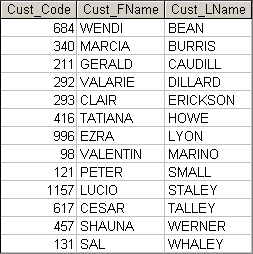 Cust Code Cust FName Cust LName 684 WENDI BEAN 340 MARCIA BURRIS 211 GERALD CAUDILL 292 VALARIE DILLARD 293 CLAIR ERICKSON 416 TATIANA HOWE 996 EZRA LYON 98 VALENTIN MARINO 121 PETER SMALL 1157 LUCIO STALEY 617 CESAR TALLEY 457 SHAUNA WERNER 131 SAL WHALEY