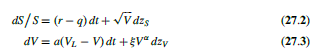 ds/s = (r - q) dt + Vī dzs dV = a(V1 – V)dt +§Vª dzv (27.2) (27.3) %3D