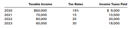 > Wynn Farms reported a net operating loss of $160,000 for financial reporting and tax purposes in 2024. The enacted tax rate is 25%. Taxable income, tax rates, and income taxes paid in Wynn’s first four years of operation were as follows