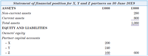 It was agreed between X, Y and Zâs representatives that on 30 June 20X9 (for the purposes of settling the affairs of Z) goodwill be valued at £120,000 and the freehold land (the only non-current asset) at £360,000. The balance owing to Z will remain on loan to the partnership for five years at a rate of 10 per cent interest per annum. X and Y agree that goodwill should not be reflected as an asset in the financial statements; however, the new value of freehold land should. They also agree that in the future they will share profits and losses equally.