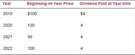 An investor buys three shares of XYZ at the beginning of 2019, buys another two shares at the beginning of 2020, sells one share at the beginning of 2021, and sells all four remaining shares at the beginning of 2022.